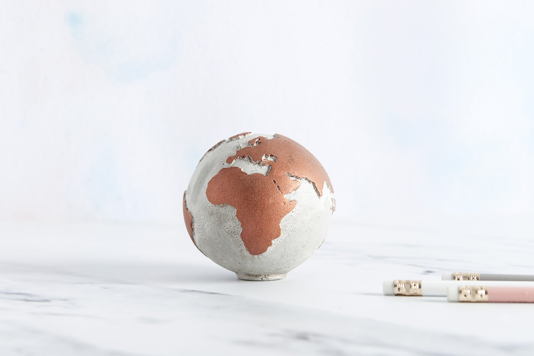 Elevate your side table or home office space with our 3d concrete globe. Each globe is cast in solid concrete with the main continents hand painted in copper or gold. perfect for celebrating an anniversary or for gifting.