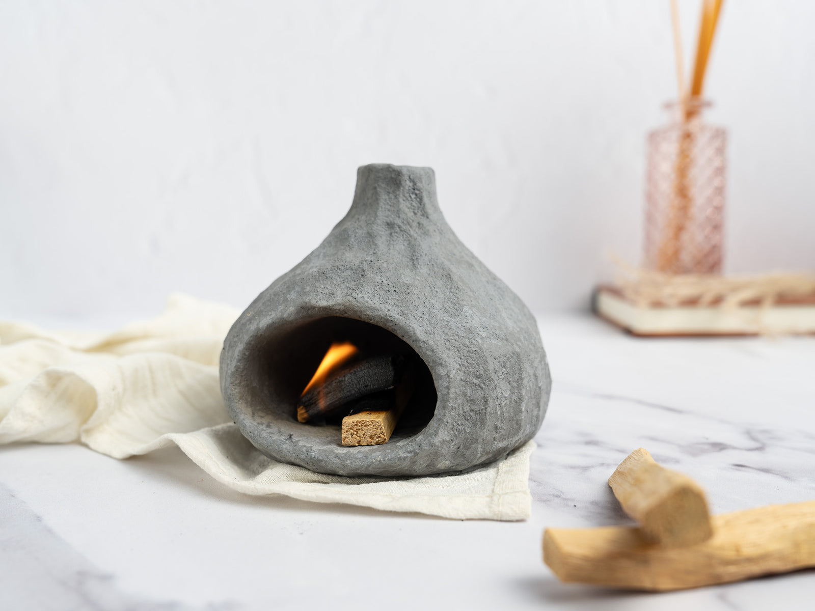 Elevate your rituals with this handcrafted concrete incense holder, featuring a striking volcanic rock texture for a raw, natural aesthetic. Designed to hold both joss sticks and Palo Santo, it creates a calming atmosphere as smoke gently rises and curls through the side chimney, adding a touch of drama to your space.